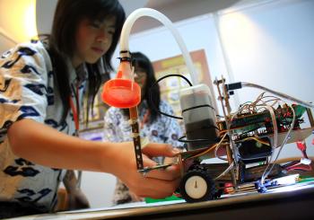 Michelle Emmanuela dan Jocelyn Ovilia tanpa ragu langsung memperlihatkan kelihaian robotnya, “Tugasnya cukup mudah yakni menyiram tanaman, dan juga tugas pertanian lainnya. Namanya Robot Penyiram Tanaman,” ujar Michelle yang ditemui di stand robotnya.