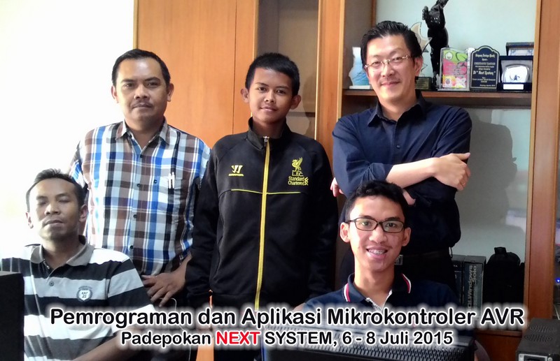 Dokumentasi usai super camp “Pemrograman dan Aplikasi Mikrokontroler AVR“, 6 – 8 Juli 2015, di Padepokan NEXT SYSTEM Bandung, bersama Sudaryanto (Rumah Micro, Bandung), Samsuduha (PT. Badak NGL, Bontang), Revy (SMKN 1 Cimahi) dan Ahmad Dhiyaaul Auliyaa (Universitas Indonesia).