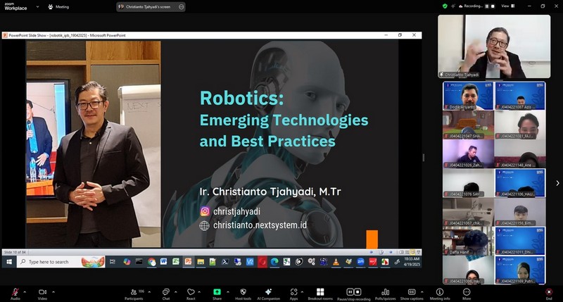 Sabtu, 19 April 2025, menjadi momen penting bagi 103 mahasiswa Program Studi Teknologi Rekayasa Komputer, Institut Pertanian Bogor (IPB). Dalam rangka persiapan memasuki masa magang, mereka mengikuti kuliah pembekalan bertema “Robotics: Emerging Technologies and Best Practices“, yang menghadirkan Ir. Christianto Tjahyadi, M.Tr., sebagai narasumber.