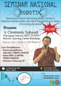 Seminar nasional robotika yang mengangkat tema “Teknologi Robotika sebagai Inovasi dalam Dunia Pendidikan” dilangsungkan di kota Solo, 29 Oktober 2011, bertempat di aula SMAN 1 Surakarta. Seminar robotika skala nasional pertama yang digelar oleh MGMP TIK SMA/MA Kota Surakarta ini, menghadirkan pembicara Ir. Christianto Tjahyadi dari NEXT SYSTEM Robotics Learning Center dan Tim Robotika Fakultas …