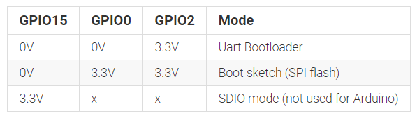 Modul ESP memeriksa pin GPIO0, GPIO2 dan GPIO15 setiap kali boot, berdasarkan mode-mode berikut: