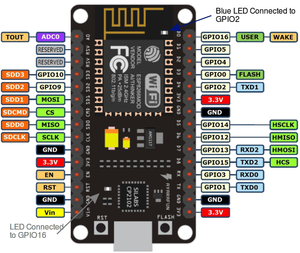 ESP8266 bekerja pada tegangan 3.3V, jadi seluruh I/O bekerja pada tegangan yang sama. Seluruh pin tidak 5V tolerant, memberikan tegangan lebih dari 3.6V pada pin akan membuat chip “bermasalah”. Arus maksimum yang dapat ditarik dari setiap pin GPIO adalah 12 mA. On board LED terhubung dengan GPIO2 dan GPIO16.